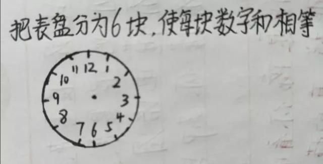 最后这一道智力题目我个人觉得最难,反正我做了很久才做出来,不知道大家需要多久呢?题目中给了一个钟表图形,要求大家把它分为6块,并且使每个数字的和都相等。刚看见这道题目时,我觉得无从下手,完全不知道该从哪个方向思,后来想了很久才找到思路。我想提醒大家,做这道题目时不一定要从中心出发,你懂我的意思了吗?