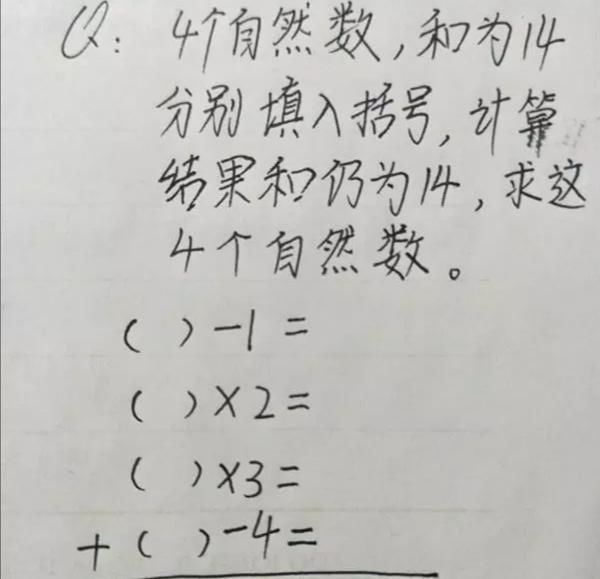 这道智力题和第一道类型差不多,但是难度就增加了。题目中同样给出了四个等式,要求大家填入四个自然数,四个自然数的和要为14且四个等式最后得出的结果相加和也要为14。四个自然数必须要满足这两个条件,才能是正确答案。想要做出这道题目,就要学会分析,找到每个等式、数字之间的联系,你能做出来吗?