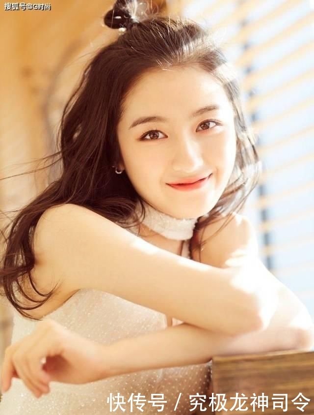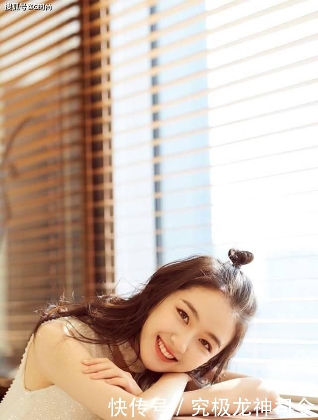 郑爽的饱满蓬松的丸子头造型,配上自然的刘海,清爽干净,又多了几分自然俏皮的味道,可爱十足,身穿针织衫,咬拇指的造型,少女感十足。