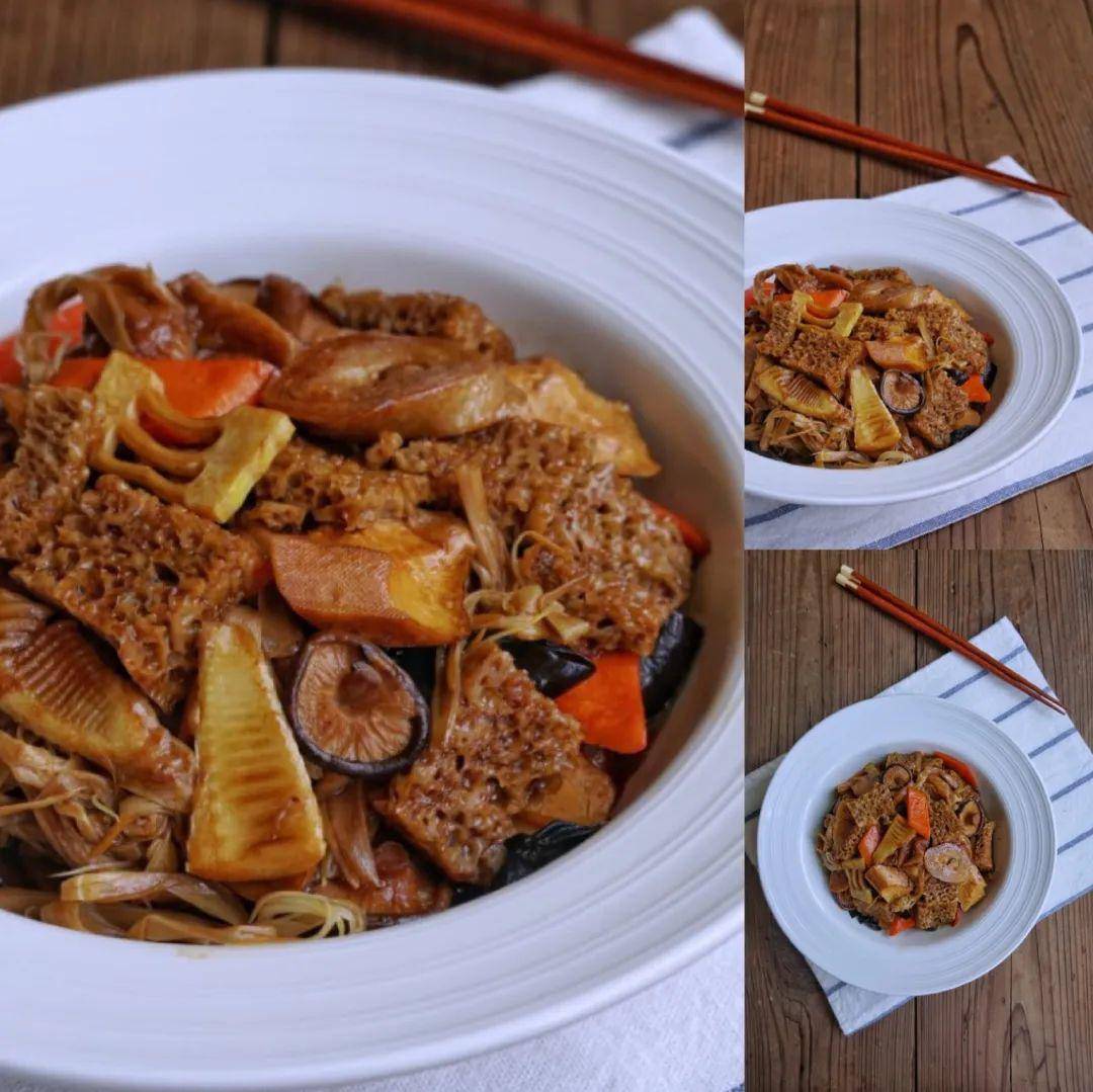 “哇”的一声,办公室的电脑前就挤满了人…我们已经说不出话来了:这个讲究的构图,充满质感的桌布, 连双筷子都是精挑细选的…盘子里的炒素似乎已经在发光了……跟着我们的菜谱一步步学成这样,真的是不容易的!