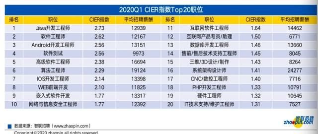 从具体职位看,2020年一季度,信息基础设施产业核心技术岗位中,缺口较大即CIER指数较高的职位以软件开发类为主,包括Java开发工程师、软件工程师、Android开发工程师、高级软件工程师、IOS开发工程师、WEB前端开发、嵌入式软件开发、互联网软件工程师、系统架构设计师等,多为5G、大数据、人工智能等各领域的通用技术人才。其中Java开发工程师的CIER指数最高,为2.73,即每个求职者对应约3个工作机会。此外,算法工程师、数据库开发工程师、CNC/数控工程师等人工智能、大数据、工业互联网领域的核心技术岗位人才缺口也较大。