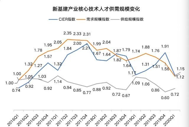 据反映人才市场供需关系的CIER指数显示,新基建信息基础设施产业的核心技术人才近年来处于供不应求状态,CIER指数长期大于1,且呈“先扬后抑”态势,指数在2017年四季度达到近年来高值2.21,即每个求职者面临2个以上工作机会,随后有所下降,2019年四季度指数为1.91,较高峰值下滑0.3。这主要是受人才招聘需求的变化影响,反映人才需求规模变化趋势的需求规模指数显示,新基建信息基础设施产业核心技术岗位的招聘人数在2017年二季度达到峰值2.35,即招聘人数比2016年一季度增长1.35倍,随后开始下行。而人才供给则相对稳定,人才供给规模指数持续在1上下波动。