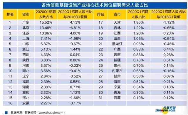 分南北方地区看,2020年一季度南方省市信息基础设施产业招聘核心技术人才数量占全国六成,且与2016年同期相比,这一比例提高11个百分点。但从变化趋势看,与2016年同期相比,西部地区表现突出,招聘人数占比提高3.33个百分点。可见近年来大数据产业在贵州等西部地区的布局及西部省市在信息产业的发力已见成效,西部地区有望借新基建之势加速崛起。