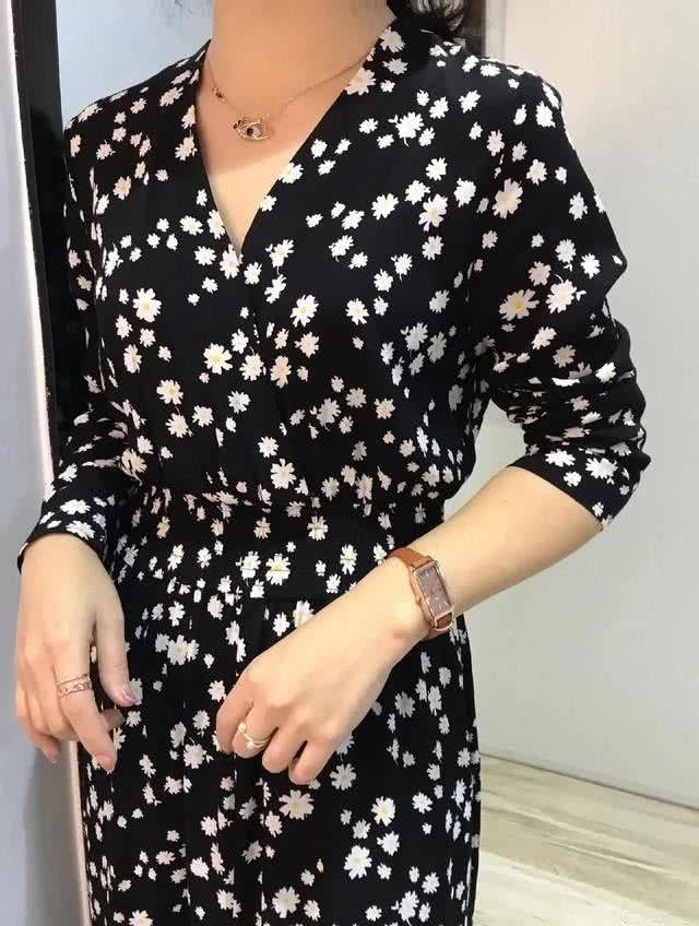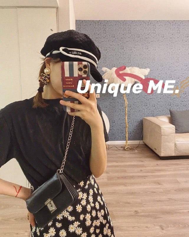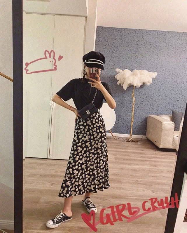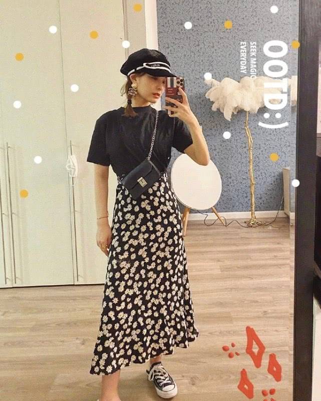 她下身搭配的雏菊元素半身裙是中长的款式,微A字型能够很好的修饰假胯宽与腿部线条,裙摆还是很自然飘逸的,稍微的褶皱感,丰富了整体的造型更显飘逸灵动的气质。上身搭配简单的黑色T恤,纯色系百搭显白显瘦,整体造型不超过三种颜色看起来很简单大方。