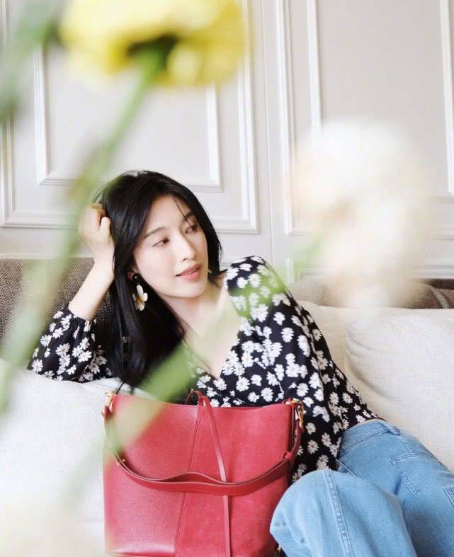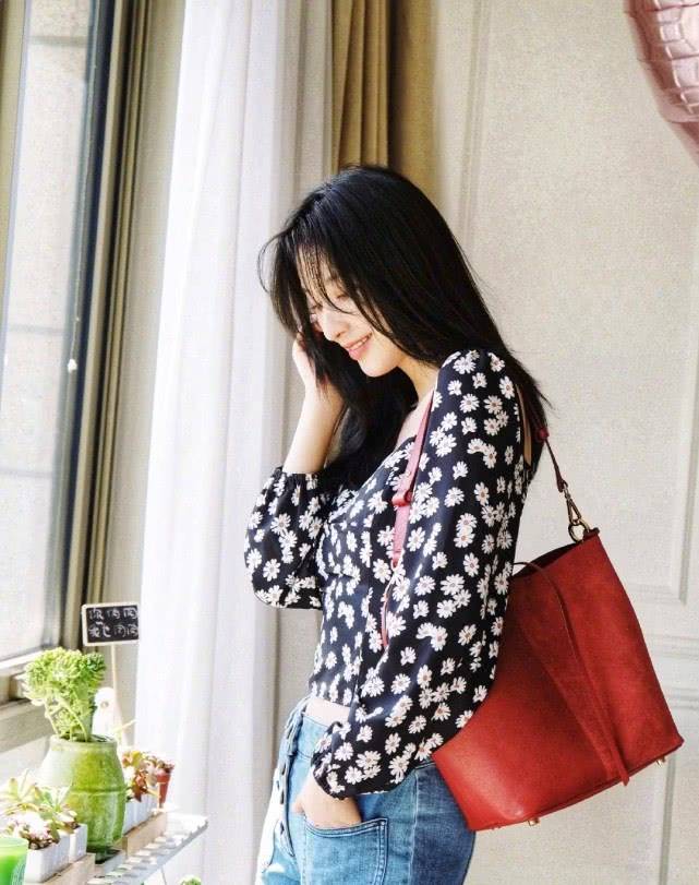 她选择雏菊元素的上衣,是短款修身的款式,能够很好地勾勒出身材曲线。腰部也是些许紧身,能够展现出自己的小蛮腰。下身搭配了一条,高腰浅色牛仔裤。宽松阔腿的款式能够很好的修饰腿部线条,高腰也能够提高腰线,在视觉上打造出大长腿的效果。肩上背着酒红色的挎包点亮了整体造型,同时,她搭配的雏菊耳环也非常的有个性,与上衣相互呼应,时尚感up up。