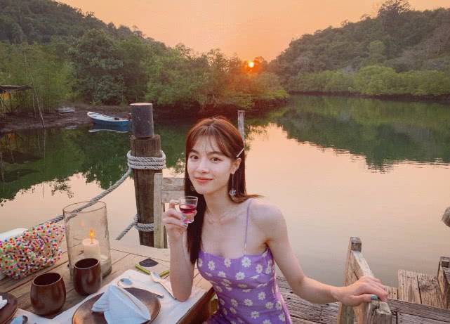 裙子的吊带是特别细的,可以将上半身性感的直角肩、肩颈线条和精致锁骨展现的淋漓尽致。裙子也是低胸的设计,大面积的白皙细腻的肌肤裸露,性感不是一点半点。紫色作为底色,白黄相间的小雏菊元素,布满了整个裙身。整体色系清新脱俗,而且很好地衬托出她的红润气色与透亮肌肤。