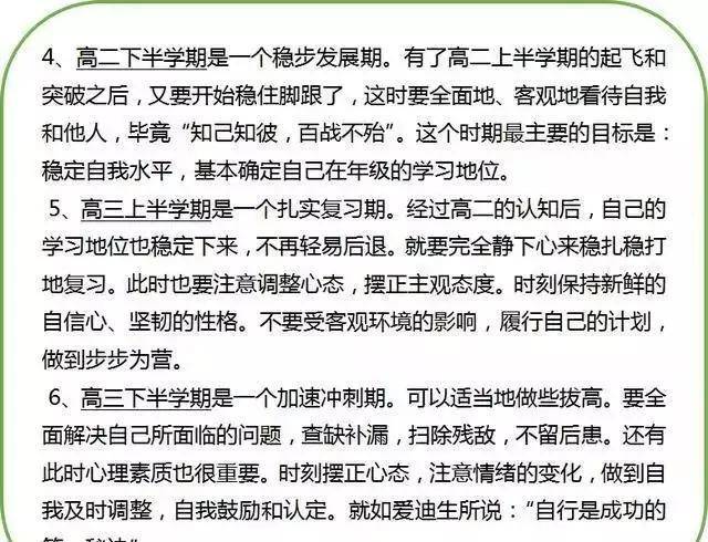 抓住这六个重要的阶段,做好每一阶段应该做的事,我们的大学梦就达到了一半,剩下的就是大家不断地坚持与努力了,所以,加油吧,高中生们!