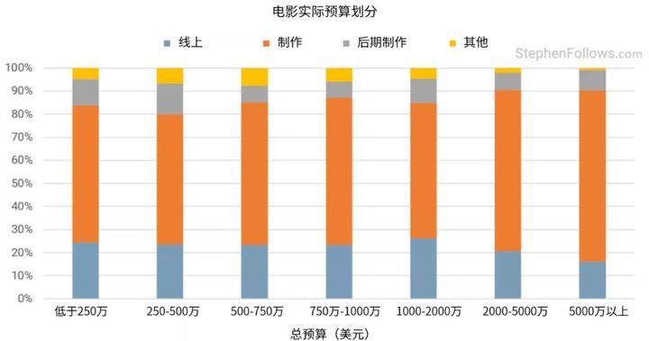 首先来了解一下总体情况。考虑到电影类型和规模的差异,从广义上来说,电影预算组成大体相当,这一点很有趣。线上成本占总预算的16%-26%,制作费用占56%-74%,后期制作占7%-13%。其他成本的变化最大,在1%-8%之间。