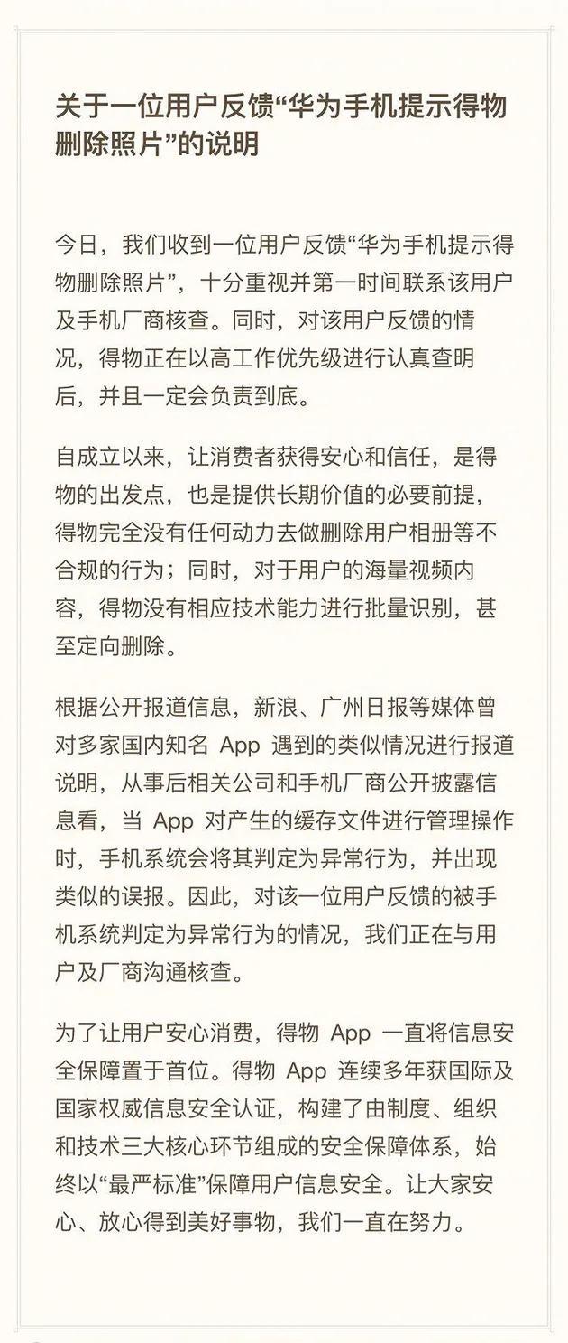 今日,收到用户反馈“华为手机提示得物删除照片”,公司已第一时间联系该用户及手机厂商核查。得物表示,公司完全没有任何动力去做删除用户相册等不合规的行为;同时,对于用户的海量视频内容,得物没有相应技术能力进行批量识别,甚至定向删除。
