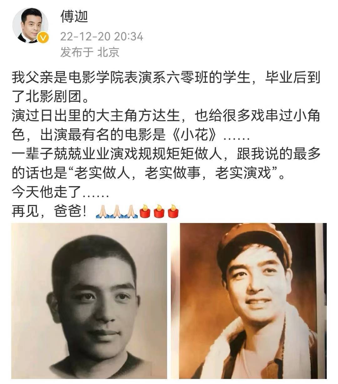 12月20日,著名演员傅祖成去世,享年82岁,傅祖成的儿子傅迦通过社交媒体发文悼念,傅迦晒出了父亲年轻时的照片,并祝愿父亲一路走好。