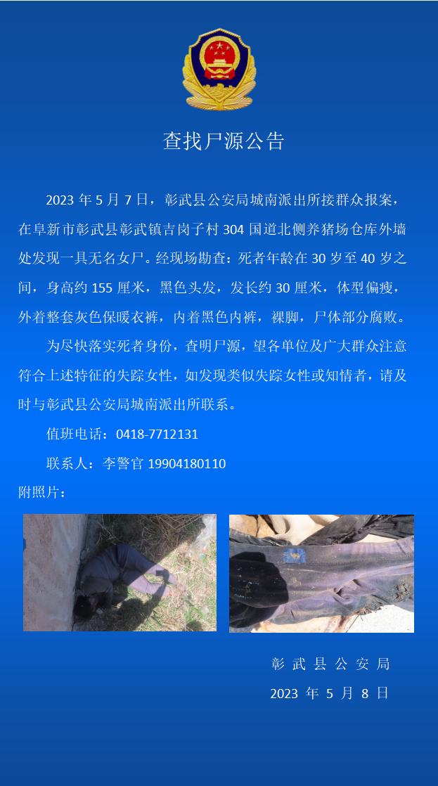 近日,彰武县公安局发布公告,2023年5月7日,彰武县公安局城南派出所接群众报案,在阜新市彰武县彰武镇吉岗子村304国道北侧养猪场仓库外墙处发现一具无名女尸。 经现场勘查: 死者年龄在30岁至40岁之间,身高约155厘米,黑色头发,发长约30厘米,体型偏瘦外着整套灰色保...