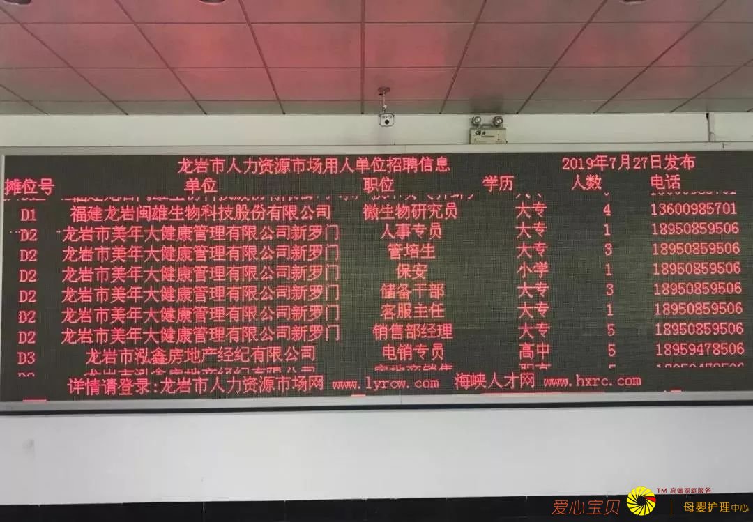 本次专场招聘会有龙岩市百师帮家政服务有限公司、龙岩心连心家政服务有限公司、龙岩市美年大健康管理有限公司新罗门诊部等40家企业参会,提供了高端管家、育婴师、月嫂、保姆、家庭护理、保安、保洁、酒店服务员、中式面点师、家庭教师、催乳师、养老护理员等900余个就业岗位供求职者选择,进场人数400余人,50余人达成初步就业意向。