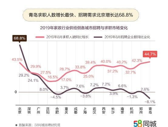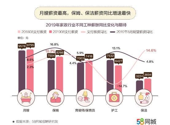为了厘清当前家政行业的招聘需求、岗位要件、薪资水平、从业者情况及消费习惯,58同城对家政行业求职者、用工企业、消费者进行了深度的调研,并发布了《中国家政市场就业及消费报告》。据58同城招聘研究院数据显示,2019年8月北京招聘需求同比增长68.8%,深圳求职活跃度最高;2019年8月家政行业薪资整体上涨,家政行业中月嫂月均薪资达9795元,消费者雇请保姆平均周期13.6个月;70后对家政服务依赖性最大,做事麻利认真是消费者对家政从业者的第一需求。