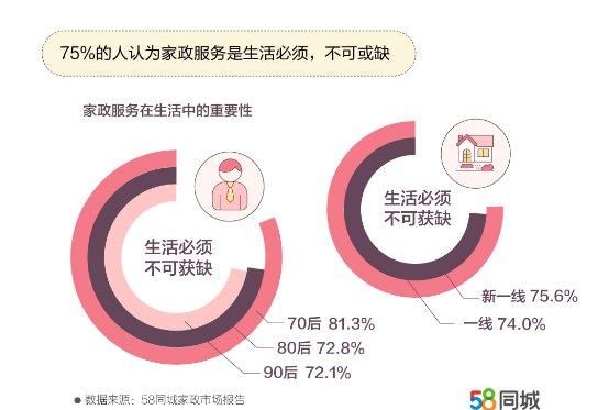 据58同城《中国家政市场就业及消费报告》统计,75.1%的人认为家政服务不可或缺,其中,81.3%的70后认为家政服务在生活中必不可少,占比高于80后和90后。由于70后处于职业发展的“黄金期”,又面临“上有老、下有小”的“中年困境”,很难有时间兼顾事业与家务,对家政服务的依赖性更强。