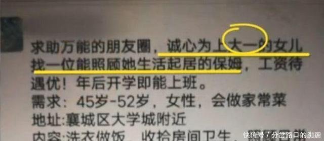 近日,湖北襄阳的刘女士 在朋友圈 招聘保姆 照顾大一女儿,帮她洗衣做饭 引发热议 诗言慧语 |http://www.5cocoi.com 刘女士称自己和丈夫平时很忙, 都有生意在身, 女儿从小娇生惯养, 自己从来没让女儿动手做过家务。 2019年女儿刚上大学时, 自己学校家里两头跑照顾...