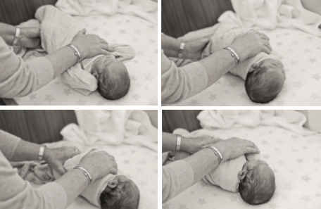 另一种方法结合了“虚拍”和“翻滚”,从宝宝的身体下方虚拍并轻推,同时又加上翻滚。这种方法也可以从臀部那一侧开始,或者向上一些,在尿布上方。