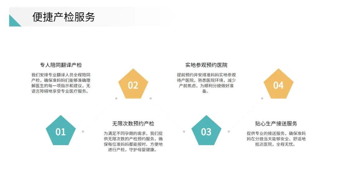 专人陪同翻译、无限次数产检、医生预约、实地参观医院、生产接送。