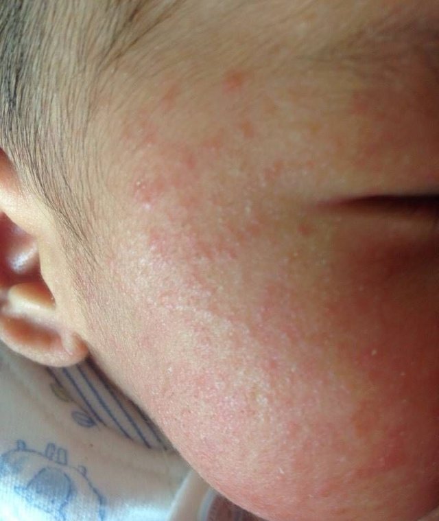 在挂号的时候旁边有个也在排队的热心大妈,她见到哭闹的笑笑,就说一看就知道这个孩子是过敏得了湿疹。期初还不信,看了医生之后医生也确诊是湿疹,应当是接触了过敏源导致的。