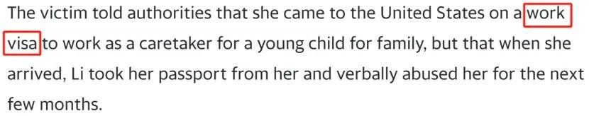 受害者表示,自己是持工作签证,从中国来到美国做住家保姆的,负责照顾一个家庭的小孩。