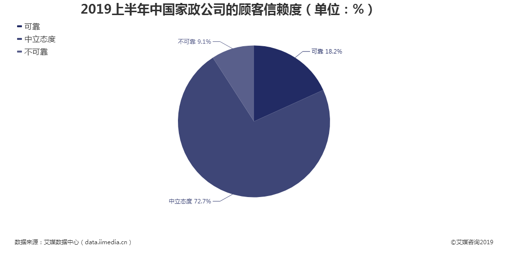 数据显示,在2019年上半年中国家政公司的顾客信赖度调查中,超七成顾客对家政公司持中立态度,仅有9.1%的顾客认为不可靠。艾媒咨询分析师认为,尽管目前中国家政公司的客户信赖度较低,但主流观点是持中立态度,仅有不足一成用户明确表示不信赖家政公司,家政公司企业应当抓住这一行业契机,尽快提升品牌知名度,率先赢得用户市场。
